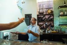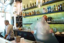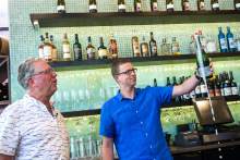 Owner Joel LaSalle and General Manager Andrew Cliburn celebrate with champagne after tearing down the Zion Curtain at Current Fish & Oyster in Salt Lake City on Saturday.