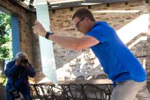 General Manager Andrew Cliburn smashes a piece of the Zion Curtain that was around their r