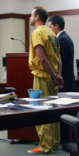 Peterson who is being held at the Salt Lake County jail in lieu of $750,000 bail stood quietly in his yellow jail jumpsuit with his hands cuffed behind his back during the brief hearing where his attorneys waived formal reading of the charges.