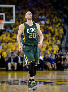 Utah Jazz forward Gordon Hayward (20) follows through on a 3-pointer Tuesday during Game 1 in Oakland, Calif.