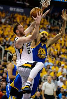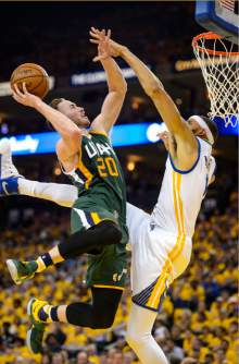 Utah Jazz forward Gordon Hayward (20) gets to the basket as Golden State Warriors center