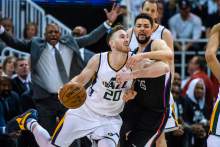 LA Clippers guard Austin Rivers (25) guards Utah Jazz forward Gordon Hayward (20) during the game at Vivint Smart Home Arena Friday, April 28, 2017.