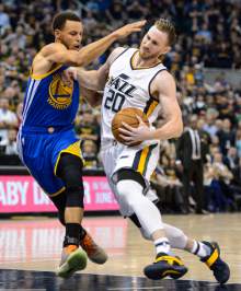 Utah Jazz forward Gordon Hayward (20) powers his way past Golden State Warriors guard St