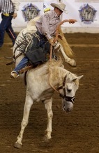 Kip Lish competes in the Bareback Riding competition at the Days of '47 Rodeo at the Maverik Center in West Valley City, Utah on Tuesday, July 24, 2012.