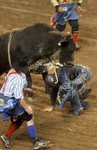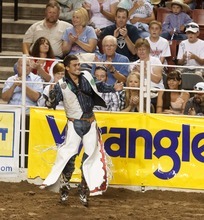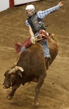 Chase Sherman competes in the Bull Riding competition at the Days of '47 Rodeo at the Maverik Center in West Valley City, Utah on Tuesday, July 24, 2012.