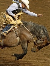Andy Clarys competes in the Saddle Bronc competition at the Days of '47 Rodeo at the Maverik Center in West Valley City, Utah on Tuesday, July 24, 2012.