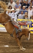 Andy Clarys competes in the Saddle Bronc competition at the Days of '47 Rodeo at the Maveri