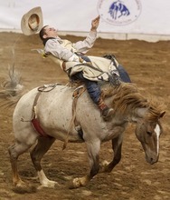 Kendall Anderson competes in the Saddle Bronc competition at the Days of '47 Rodeo at the Maverik Center in West Valley City, Utah on Tuesday, July 24, 2012.