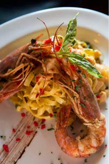 A plate of house-made tagliatelle dressed with chunks of tender salmon in a light cream sauce ($19.95) was rich and subtly smoky, topped with a spoonful of caviar and a slice of smoked fish. It was big enough for a satisfying dinner and lunch the next day. An entrée of salmon with a lemon and caper cream sauce ($22.95) was perfectly cooked and came with a generous portion of crisply cooked vegetables that included broccoli, zucchini, snow peas, carrots and mushrooms.