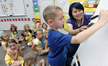 They can stand up and sit down when teacher Pei Chi Chang commands them in her native language. And when visitors peek into the classroom, students offer an enthusiastic "Ni hao!" instead of the English "Hello."