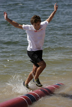 Will Hoeschler of La Crosse, Wis., an amateur log rolling world champion from a family of log rollers, demonstrates the artificial Key Log. The product was one of many featured at the Open Air Demo Day of the Outdoor Retailer Summer Market at Jordanelle State Park on Wednesday. More than 150 outdoor brands and many more retailers are at the reservoir to show off and experience first-hand the new gear coming out for summer 2013.