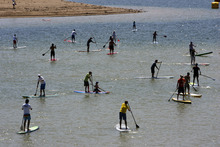 Dozens of stand up paddle boarders take to the water for the Open Air Demo Day kicking off the Outdoor Retailer Summer Market at Jordanelle State Park on Wednesday, August 1, 2012. More than 150 outdoor brands and many more retailers are at the reservoir to show off and experience first-hand the new gear coming out for the summer of 2013. More than 27,000 are expected to attend the twice a year convention held at the Salt Palace Convention Center which runs Aug. 2-5.