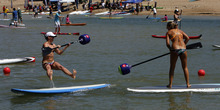 Allison Riddle of Hermosa Beach, left, and Gemma Bark of Palos Verdes California battle it out on SUP boards in the "Psycho Joust" as the Open Air Demo Day takes to the water kicking off the Outdoor Retailer Summer Market at Jordanelle State Park on Wednesday, August 1, 2012. More than 150 outdoor brands and many more retailers are at the reservoir to show off and experience first-hand the new gear coming out for the summer of 2013. More than 27,000 are expected to attend the twice a year convention held at the Salt Palace Convention Center which runs Aug. 2-5.
