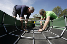 Peter Carati, left, and Keith Patterson asseble an "Ally" collapsable canoe of Bergen