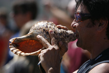 Kenji Haroutunian sounds the horn marking the start of the race between the giant multi person stand up paddle board named Supzilla and the King Kong canoe as the Open Air Demo Day took to the water kicking off the Outdoor Retailer Summer Market at Jordanelle State Park on Wednesday, August 1, 2012. More than 150 outdoor brands and many more retailers are at the reservoir to show off and experience first-hand the new gear coming out for the summer of 2013. More than 27,000 are expected to attend the twice a year convention held at the Salt Palace Convention Center which runs Aug. 2-5.