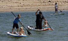 Rob Bolding, center, with Red Mountain Outfitters in St. George takes his daughter Erika, 6, for a demo spin as his son Seth, 11, gets a ride from friend Jake Everett, 10, as the Open Air Demo Day takes to the water kicking off the Outdoor Retailer Summer Market at Jordanelle State Park on Wednesday, August 1, 2012. More than 150 outdoor brands and many more retailers are at the reservoir to show off and experience first-hand the new gear coming out for the summer of 2013. More than 27,000 are expected to attend the twice a year convention held at the Salt Palace Convention Center which runs Aug. 2-5.