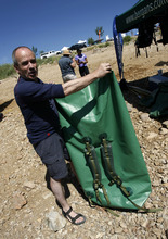 Peter Carati shows off the small bag that fits the "Ally" collapsable canoe of Bergens of Norway during the Open Air Demo Day which kicked off the Outdoor Retailer Summer Market at Jordanelle State Park on Wednesday, August 1, 2012. More than 150 outdoor brands and many more retailers are at the reservoir to show off and experience first-hand the new gear coming out for the summer of 2013. More than 27,000 are expected to attend the twice a year convention held at the Salt Palace Convention Center which runs Aug. 2-5.