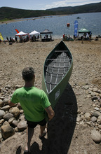 Peter Carati, bottom, and Keith Patterson move an assebled "Ally" collapsable canoe of Bergens of Norway during the Open Air Demo Day which kicked off the Outdoor Retailer Summer Market at Jordanelle State Park on Wednesday, August 1, 2012. More than 150 outdoor brands and many more retailers are at the reservoir to show off and experience first-hand the new gear coming out for the summer of 2013. More than 27,000 are expected to attend the twice a year convention held at the Salt Palace Convention Center which runs Aug. 2-5.