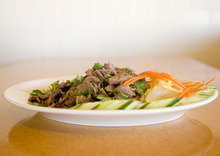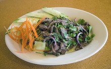 You can find one of my favorite dishes at Thai Aroy-D on the salad portion of the menu. Beef waterfall ($8.99) is a hefty platter of thinly sliced barbecued beef layered over crunchy lettuce, the beef seasoned with oodles of lime juice and pungent fish sauce. Red onions, tons of cilantro, and mint leaves add to a dish that pulls no punches, offering an explosion of in-your-face flavor especially when ordered on the higher end of the spice-spectrum.