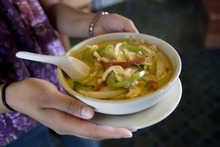 Stir-fry dishes left me feeling underwhelmed. Staples like Pad ga prow ($8.99) a saute of meat, bell peppers, onion, and carrots can often be an aromatic, heady affair elevated by herbs like Thai basil, but there wasn't enough flavor here. I felt similarly about Pad priaw wan ($8.99), a sweet-and-sour sauced stir-fry studded with hunks of pineapple, that tasted just ok.
