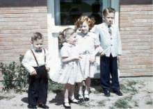 This is a picture of my siblings and me outside the chapel of Zaragoza Air Force Base in Spain. The year is 1960. I'm the kid on the far right.