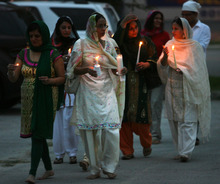 Members of the Sikh Temple of Utah, walk outside the temple during a candlelight vigil for the victims of the shooting at the Wisconsin Sikh Temple. The service was at the temple in Taylorsville, Utah Wednesday August 8, 2012.