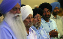 Men listen during a prayer service at the Sikh Temple of Utah, for the victims of the shooting at the Wisconsin Sikh Temple, in Taylorsville, Utah Wednesday August 8, 2012.