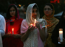 Members of the Sikh Temple of Utah, place their candles outside the temple during a candl