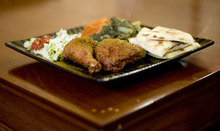 For lighter meals, the restaurant's wraps come in four varieties: shwarma, curry fried fish, keema kabob and veggie curry. All wraps start as a large, warmed pita, then are layered with crunchy salad and a mix of sauces, both a white cooling sauce and spicy red chile sauce. The shwarma piles chunks of seasoned chicken breast onto the wrap and was my pick of the bunch I could happily eat these day in day out for lunch. Chicken keema was the least interesting wrap option, ground chicken seasoned with garlic, ginger and spices, proving just a little dry. The curry fried fish was better, thanks to hunks of curry-powder seasoned white fish, perfectly moist from the fryer.