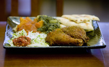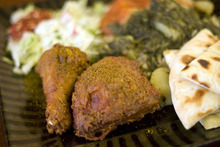 Other plate options include a grilled tandoori chicken option served with three pieces of tandoori-seasoned chicken; a curry fried fish plate, a chicken keema plate with two ground chicken patties, and a shwarma plate.