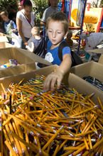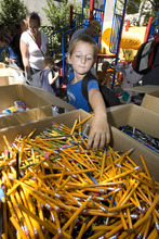 Skyler Coulten-Slaten, 7, reaches into a large box of pencils as he fills his bag with school supplies. He was one of the 150 school-aged children living at The Road Home Shelter who received back-to-school items thanks to the Apple Tree Program, a four-week campaign by the shelter to collect new clothing and school supplies. Apple Trees with paper apples attached, featuring specific children's needs, were set up at various business in the area and participants bought items for their chosen child.