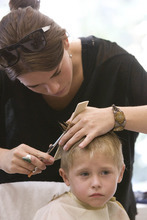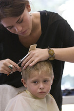 Jeremiha Rundle looks less than happy getting his back to school hair cut from Lauren Sims. Th