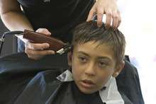 After receiving his back to school clothes and supplies Antonio Martinez, age 7, gets a back to school haircut from Vanessa Walker of The Avada Institute Provo. He was one of the 150 school aged children living at The Road Home Shelter who received back to school items thanks to the Apple Tree Program, a four week campaign by the shelter to collect new clothing and school supplies. Apple Trees with paper apples attached, featuring specific children's needs, were set up at various business in the area and participants bought items for their chosen child.