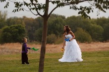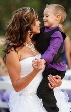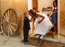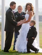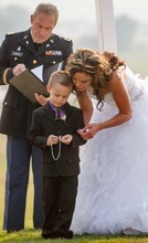 Four-year-old T.J. Carver is the ring bearer for his mother and new stepfather; Comer's 20-month-old daughter, Scarlett, watches them exchange vows from her grandmother's arms.