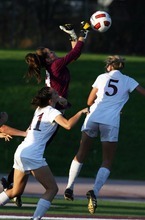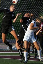 Jordan High School players (left) Whitney Tuckfield and (right) Tori Smith can't get high enough over Murray goal keeper Lizzie Tyler during a girls soccer game at Jordan High School in Sandy, Utah on August 23, 2012.