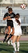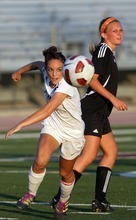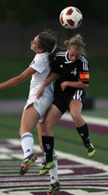 Jordan High School player (right) Jacqueline Williams and Murray player Victoria Riches battle for a ball in the air during a girls soccer game at Jordan High School in Sandy, Utah on August 23, 2012.