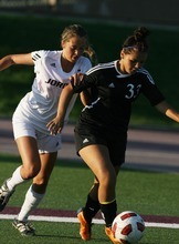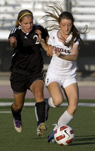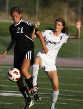 Jordan High School player (left) Tori Smith and Murray player Breanna Archuleta battle for the ball during a girls soccer game at Jordan High School in Sandy, Utah on August 23, 2012.