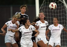 Jordan High School player (from left) Ashlie Miller, Whitney Tuckfield and Amanda Durrant battle for a ball in the air with Murray player Breanna Archuleta during a girls soccer game at Jordan High School in Sandy, Utah on August 23, 2012.