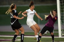 Jordan High School player (middle) Kyara Brown taps the ball in the goal past Murray goalie Lizzie Tyler during a girls soccer game at Jordan High School in Sandy, Utah on August 23, 2012.