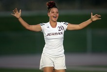 Jordan High School player Kyara Brown celebrates scoring against Murray during a girls soccer game at Jordan High School in Sandy, Utah on August 23, 2012.