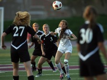 (left) Murray player Iasia Beh heads the ball in the air during a girls soccer game against Jordan at Jordan High School in Sandy, Utah on August 23, 2012.