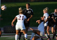 (left) Murray player Iasia Beh heads the ball in the air during a girls soccer game against Jorda