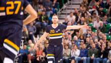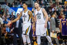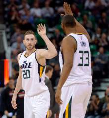 Utah Jazz forward Gordon Hayward (20) gets a high-five from Utah Jazz center Boris Diaw
