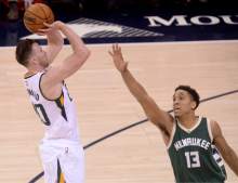 Utah Jazz forward Gordon Hayward (20) shoots over Milwaukee Bucks guard Malcolm Brogdon (13