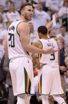 Utah Jazz forward Gordon Hayward (20) Utah Jazz forward Joe Ingles (2) Utah Jazz center Ru