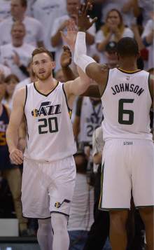 Utah Jazz forward Gordon Hayward (20) celebrates play with Utah Jazz forward Joe Johnson (