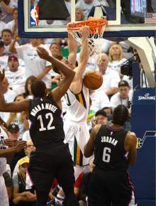 Utah Jazz forward Gordon Hayward (20) stuffs the net over LA Clippers forward Luc Mbah a M