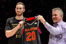 Utah Jazz forward Gordon Hayward (20) is presented with his All-Star jersey by Greg Miller