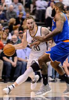 Utah Jazz forward Gordon Hayward (20) drives on New York Knicks center Kyle O'Quinn (9) as the Utah Jazz host the New York Knicks, NBA basketball in Salt Lake City, Wednesday March 22, 2017.