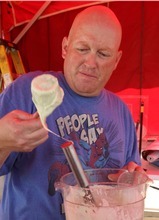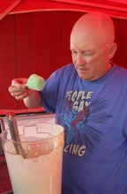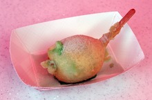 For this year's signature offering (which costs $5), he mixes the green gelatin, then adds it to what he refers to as his "State Fair Famous Deep Fried Guy" batter, and pours it into the fryer, and the concoction is plunged into hot oil for about 30 seconds. Afterwards, the treat is topped with more gelatin.